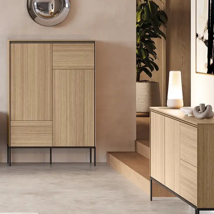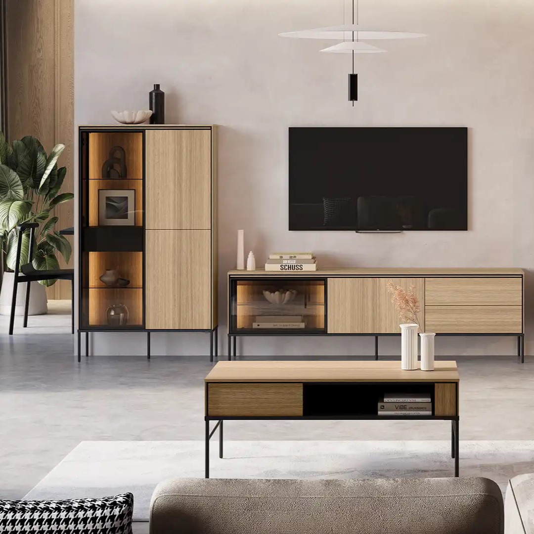 Metalowe nogi dodadzą Twojemu wnętrzu lekkości, sprawiając, że przestrzeń stanie się pełna lekkości i swobody. Dzięki głębokim półkom, estetyka i funkcjonalność splatają się w jedną całość, tworząc magiczny i unikatowy klimat. Kolor dębu linearnego w połączeniu z czernią sprawia, że komody doskonale komponują się z każdym wnętrzem, bez względu na styl. Ich uniwersalny design wprowadza ciepło i elegancję.